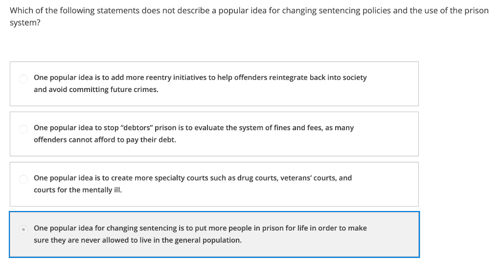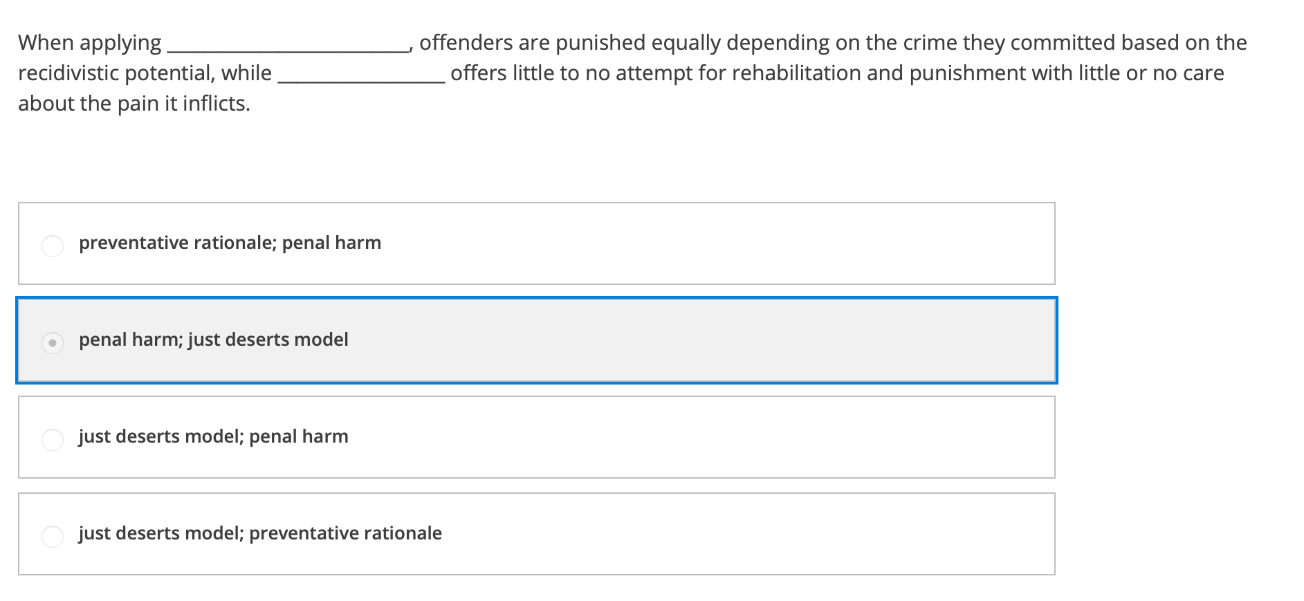 Which ethical system is used to support preventing crime using deterrence incapacitation andor treatment. Penal harm refers to _____. Penal harm refers to ____ the idea that the system intentionally or uncaringly inflicts pain on offenders during their imprisonment. Question 1 025 025 pts In Kauffmans description of the correctional officer subculture someone who. Should intentionally inflict pain on offenders during their imprisonment. Which ethical system is used to support preventing crime using deterrence incapacitation andor treatment. Question 30 Penal harm refers to the idea that the system. Intentionally inflicts pain on o ff enders during their imprisonment because merely depriving them of liberty is not considered su ffi ciently painful Answers. Donate your notes with us.